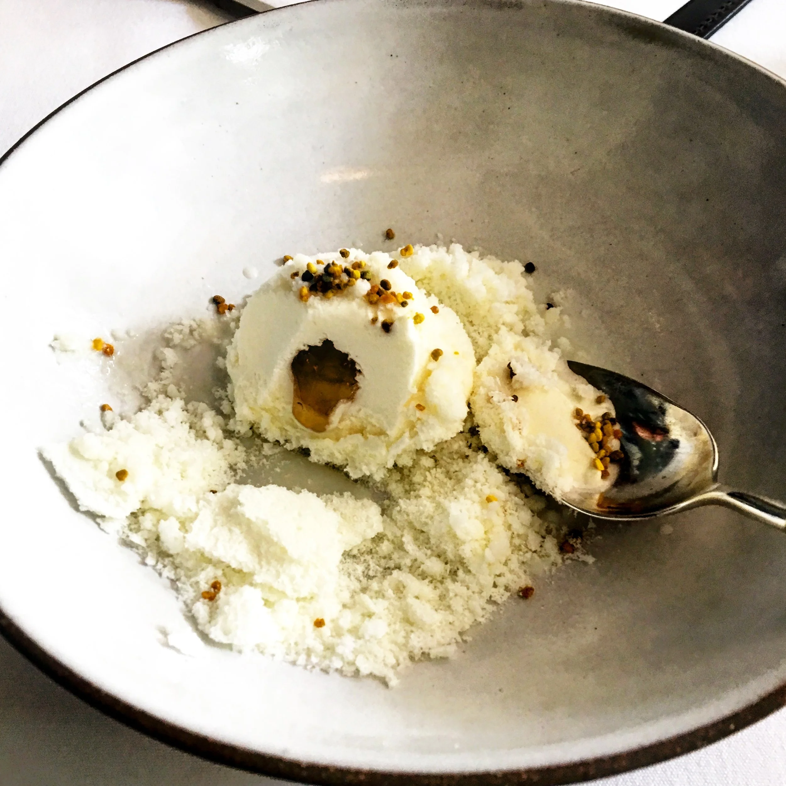 The bee pollen topped, honey-filled Milk and Honey dessert was an unforgettable ending to our 11-course meal at Eleven Madison Park (top photo). The NoMad Hotel's version with crisp honey brittle compliments the casually-elegant aesthetic of your dining experience (photo above). Everytime we taste that honey brittle, we know we are at the NoMad Hotel! The newest addition to the Milk and Honey trifecta came with the opening of Made Nice. This recently opened, highly anticipated fast casual restaurant put its own twist on the classic dessert, creating a soft serve version (see below).