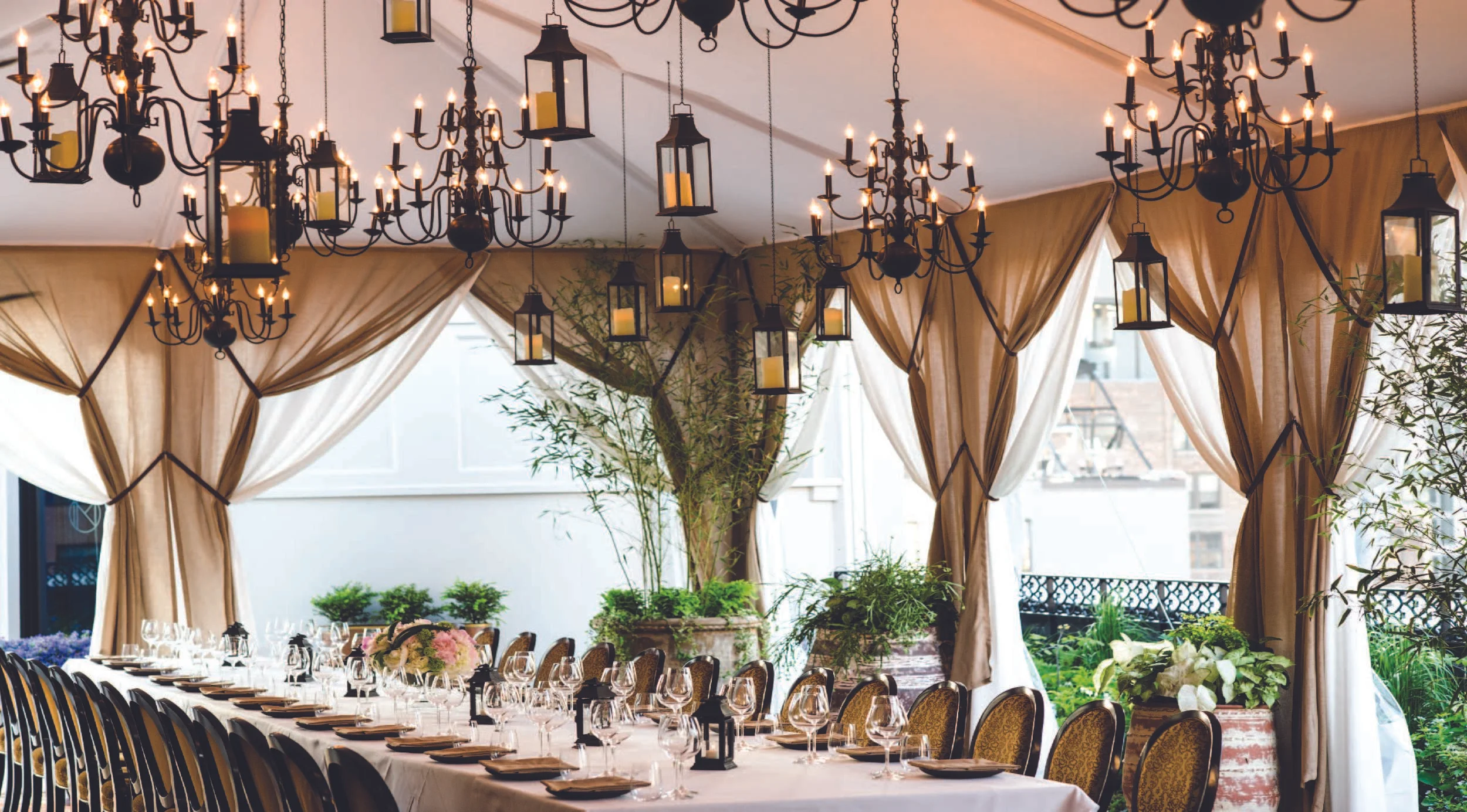 When it comes to decor, use the event space to your advantage. Find a venue that is unique in itself. The more your space has to offer, the less decor you will need. Maybe it has multiple chandeliers hanging from the ceiling (like The NoMad Hotel above) or has floor to ceiling windows that offer breathtaking views; either way they are both included in your venue price.