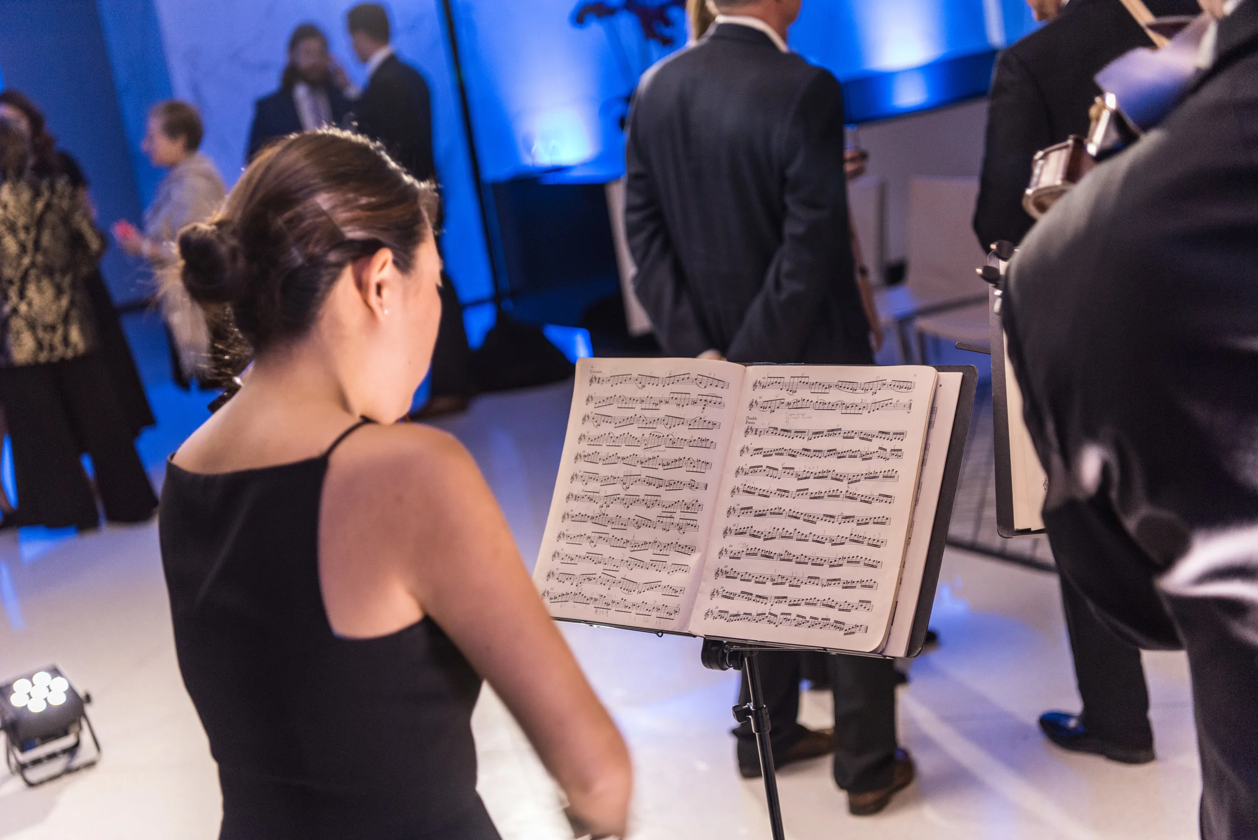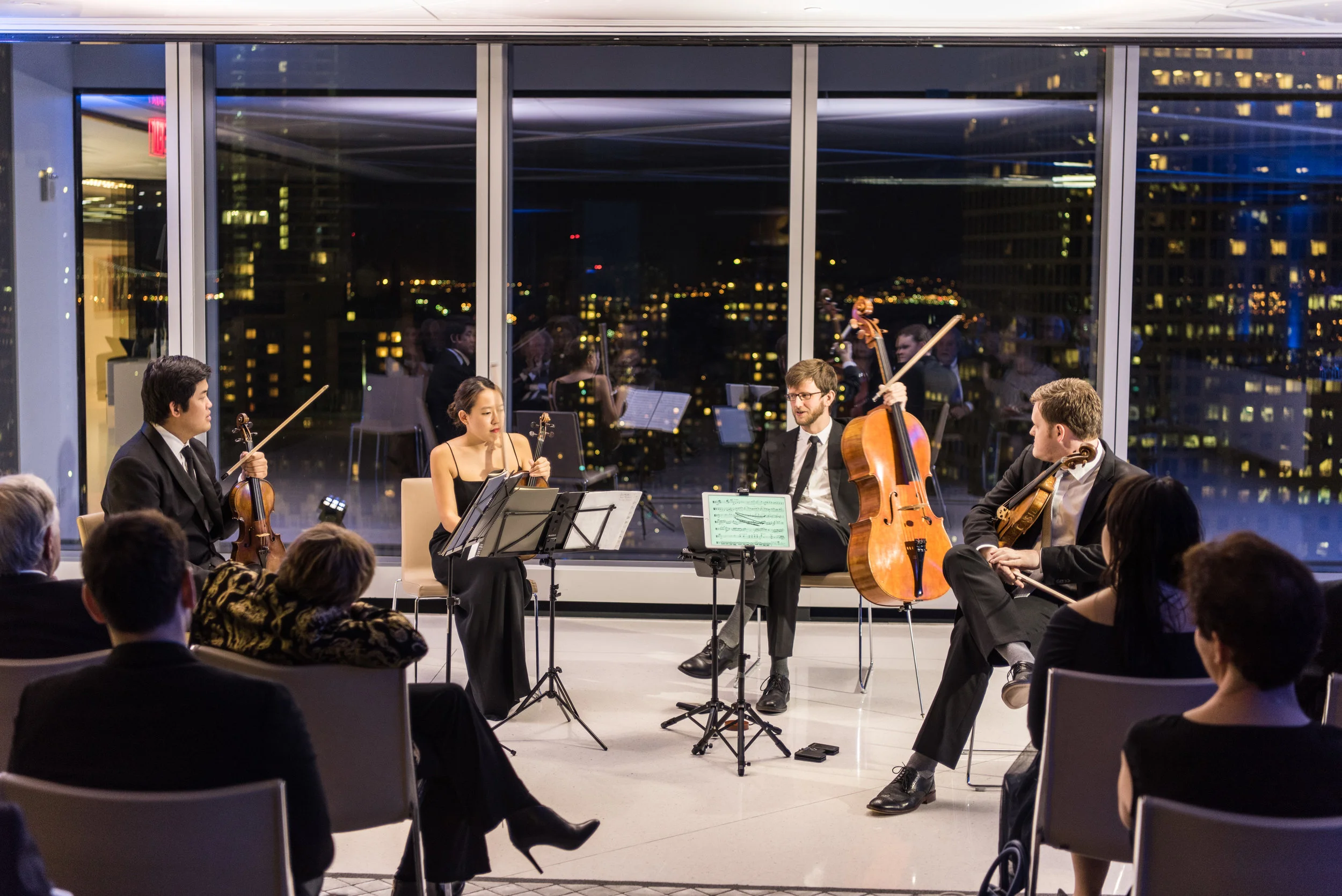 Planning part two of a 60th surprise party taking place in three different cities in two continents on three consecutive Saturdays took us to the 34th floor of One World Trade Center. Guests enjoyed Champagne and canapés while admiring the 180 degree skyline and Statue of Liberty views. A quartet from world-renowned Juilliard School performed a full length concert that featured Antonín Dvorak, a native of the guest of honor's home country, with intimate question & answer sessions interspersed. Guests ascended to the 35th floor for a 3 course dinner, finding their seat by geometric intersecting place cards designed after One World Trade Center.