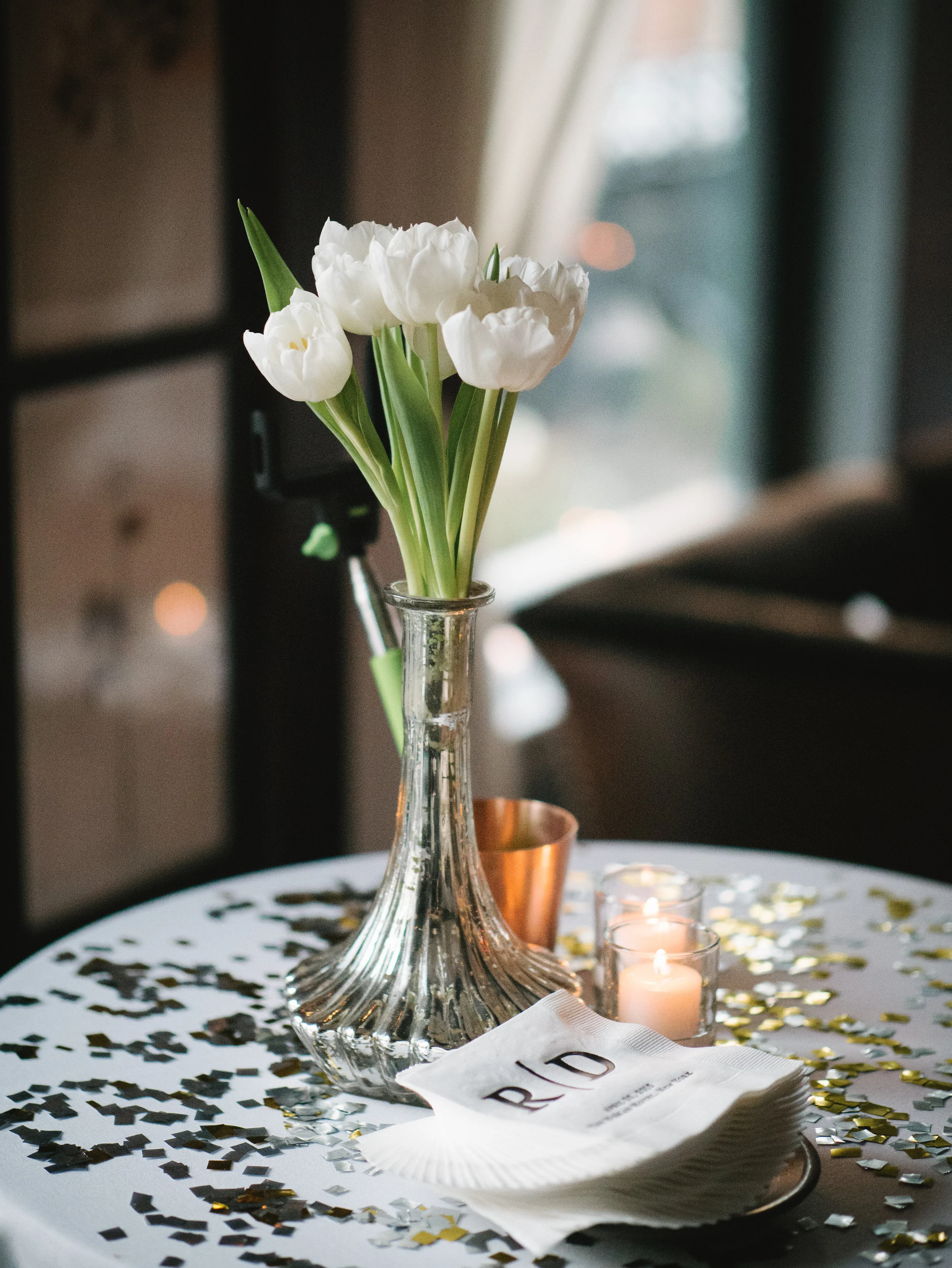 Black and white were the colors of the day for this relaxed black-tie affair. The stunning NoMad Library was the backdrop for the groom's gifting of custom bobblehead dolls to his groomsmen. The wedding started at The Church of Saint Francis Xavier and continued back at The NoMad Hotel. Selfie sticks placed around the room and a photo booth encouraged guests to capture the evening from their point of view.